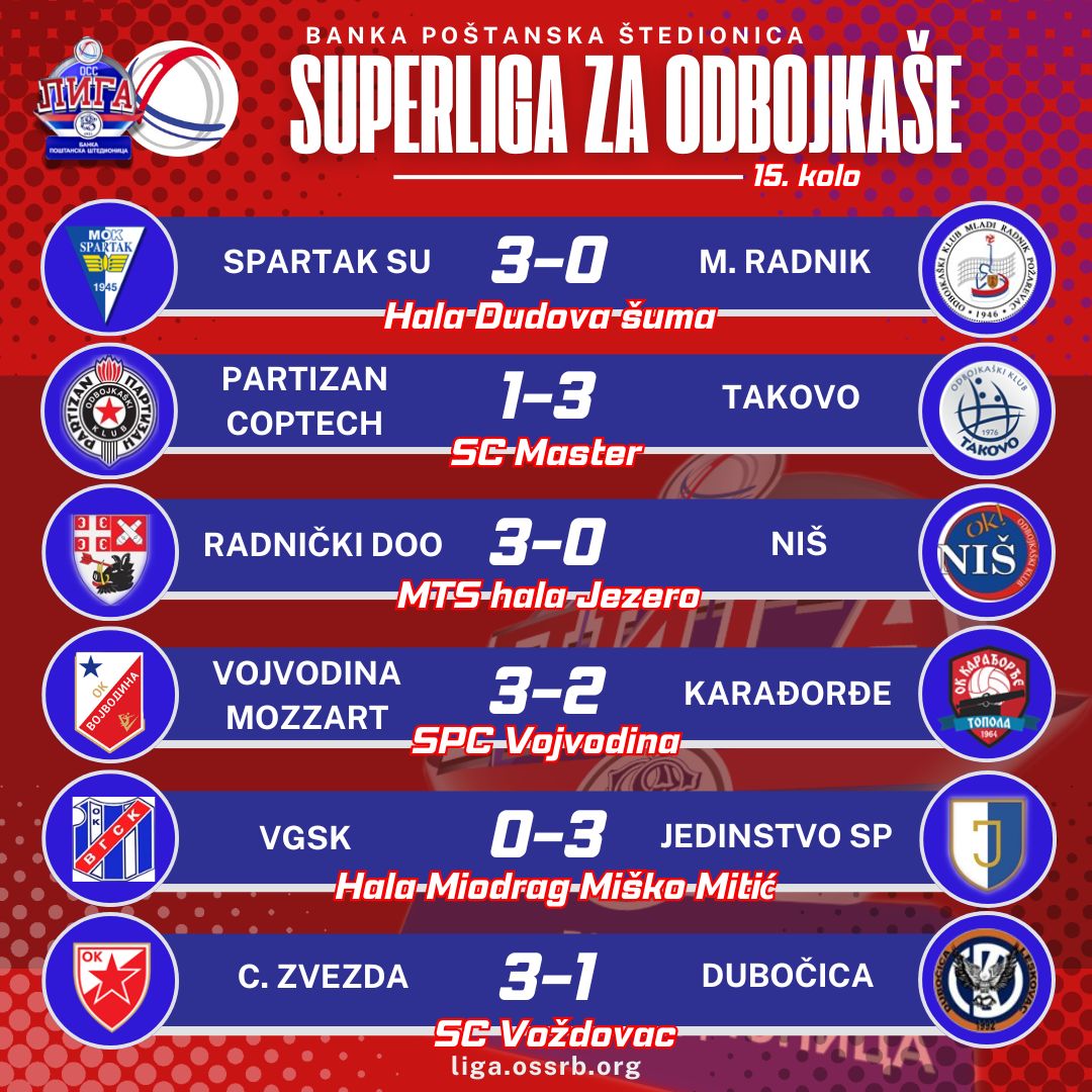 Протеклог викенда одигране су све утакмице петнаесте рунде такмичења у Банка Поштанска штедионица Суперлиги, током које смо имали прилику да на теренима широм Србије пратимо и више него занимљиве мечеве. Иако је током овог кола виђено неколико веома узбудљивих мечева, дефинитивно су највеће изненађење направили искусни Пазовчани, који су убедљиво поразили ВГСК. На победничке стазе вратили су се суботички Спартак и крагујевачки Раднички, док су Звезда и Таково након четири одиграна сета били бољи од Дубочице, односно Партизана Коптех. Ипак, најнеизвесније и најузбудљивије било је у Новом Саду, где је Војводина након низа преокрета и дугих пет сетова успела да надигра Вождове из Тополе.