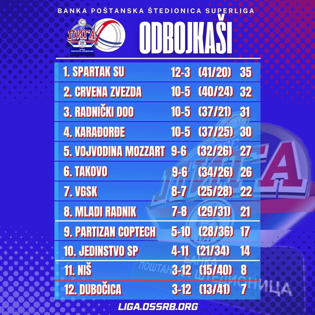 Након пораза у минулом колу, победама су се за викенд радовали одбојкаши Спартака и Радничког. Суботичани су на свом терену угостили Млади радник, који у последњих неколико утакмица бележи променљиве резултате, али против фаворита увек игра на веома високом нивоу. Ипак, колико год да су се изабраници Владана Аварамовића трудили на северу Бачке, Спартак је просто био непремостива препрека за Пожаревљане. Са друге стране, Раднички је експресно успео да се отрезни након пораза од Такова, и то против екипе Ниша, која се грчевито бори за опстанак. А колико је тим Алексе Брђовића био ефикасан, говори чињеница да им је за тријумф над аутсајдером било потребно нешто више од 70 минута игре.